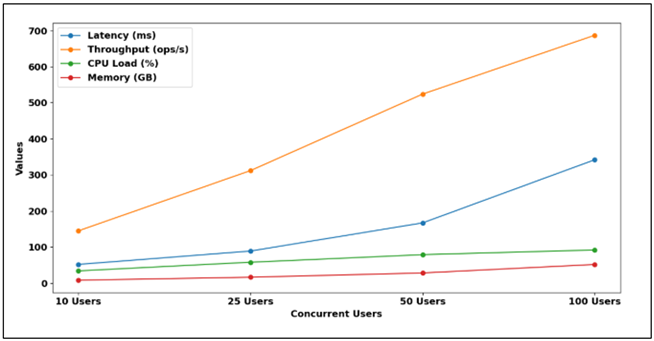 Scalability testing ensures that it is done well when there is a difference in loads. With 50 concurrent users, which corresponds to large collaborative teams, the system achieved latency of less than 200ms, which is responsive in creative workflow interactions. The use of resources was also moderate with CPU load of 79% and memory consumption of 28.3GB, which left headroom to computational surges in the case of AI generation activities. Figure 5 demonstrates the trends of scalability of the system with the number of concurrent users, indicating that the latency increases and the throughput is also enhanced. It shows increasing CPU and memory usage with increased loads, as it shows efficient parallel execution at the expense of resource requirements and performance with large scale collaborative settings. Figure 5