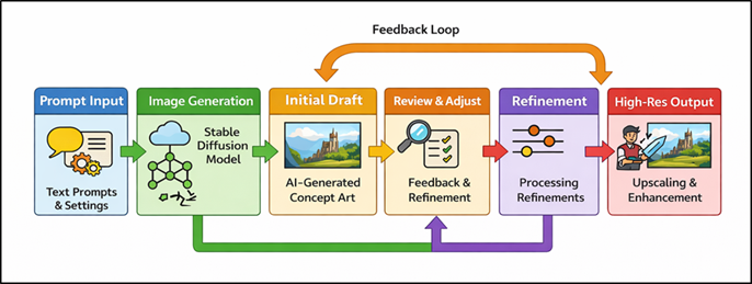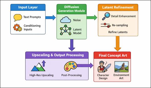 1. INTRODUCTION Artificial intelligence (AI) is making its fast progress, and the field of digital art and creation of visual content has changed greatly. Some of the most impactful processes include the creation of generative models that can create high-quality images based on a written description that can significantly transform concept art pipelines. As the design element of the underlying visual guide in manufacturing, as in gaming, film, animation, and virtual production, concept art is historically based on repetitive manual cycles that demand significant time, artistic skills, and exploration. Nonetheless, AI-based generative methods have led to novel paradigms, which have increased efficiency and innovation capacity. The stable diffusion models can be considered the significant innovation in the field, as it uses the latent diffusion mechanisms to produce images that are both visually consistent and semantically relevant. In contrast to previous generative models, these models are trained to denoise latent representations sequentially and are conditioned by textual prompts, which allows tightly controlling style, composition and thematic content Foroozani and Ebrahimi (2021). This feature enables artists and designers to quickly prototype a myriad of visual ideas, experiment with a variety of artistic directions, and improve ideas with very little manual intervention. As a result Stable Diffusion has become an effective means of enhancing human creativity but not eliminating it. The popularity of Stable Diffusion in concept art pipelines has been increasing due to its accessibility, scalability and flexibility to a variety of creative work. These models have enabled quick ideation and iteration by supporting character design and visualization of the environment, mood boards, and pre-visualization. Moreover, the combination with the immediate engineering methods allows users to direct the generative process with more and more specificity, thus more artistic control is achieved Li and Zhu (2024). In Figure 1, prompt-driven diffusion pipeline is used to produce concept art outputs that are refined. The result of this trend has been the emergence of hybrid workflows where human designers work in collaboration with AI systems with the aim of producing greater levels of innovation and productivity. Figure 1