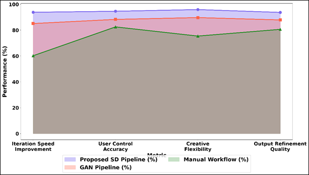 The rate of speed improvement in the iterations is considerably greater, 93.80 percent, which shows the capability of the pipeline to produce and adjust numerous design variations as quickly as possible. This has a massive improvement in creative exploration - as compared to GAN (85.10%) and manual approaches (60.20%). The accuracy of user control is also 94.60 wherein better results show that user intent matches the generated outputs due to the prompt-based conditioning.