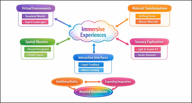 1. INTRODUCTION The development of immersive metaverse art installations is a revolutionary change in the conceptualization of artistic experience, its creation, and impression. Conventionally, art has existed in material space, physical limitations, and in which the qualities of a material, like texture, weight, and permanence, determine the process of creation, as well as the relationship between the artist and the audience. But with the creation of the metaverse through the development of virtual reality (VR), augmented reality (AR), and spatial computing, these norms have been radically broken due to the creation of spaces that overcome the restrictions of physical spaces. Such digitally mediated spaces have meant that artists are no longer restricted to the power of gravity, size, or material availability and that they can create broad, versatile, and participatory artistic spaces. The very essence of this change is the redefinition of space Liao et al. (2022). Space in metaverse spaces ceases to be a fixed Euclidean space but a programmable object with the ability to expand, be distorted and transformed in real time. Most importantly, artists have the ability to create non-linear and multi-dimensional spaces that question a conventional perspective and navigation. This change makes it possible to create immersive experiences where the users cannot just be observers but active participants that can explore, manipulate, and influence the environment. As a result, spatial perception becomes subjective and dynamic and it is influenced by the system design as well as the interaction between the user. It is also important to mention that the element of materiality evolves in the metaverse Contreras et al. (2022). In contrast to physical physical art, which uses concrete material (stone, metal, canvas, etc.), metaverse installations make use of the digital constructs: textures, shaders, and light simulations, in order to replicate or completely rethink the characteristics of materials. Figure 1 depicts the immersive environments to alter spatial perception and demateriality digital This demolition enables the development of hybrid materials, which are not present in the real world, including surfaces that react to a user input or objects that dissolve, morph, and regenerate with time. Figure 1 |