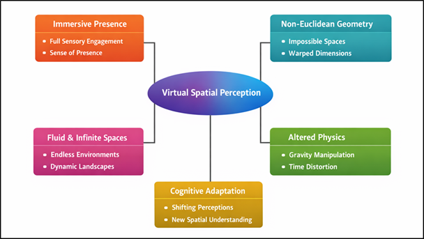 Spatial perception is radically reinvented in immersive metaverse spaces by breaking down the physical environment and presenting new spatial logic as programmable. The virtual spaces enable dynamic, variable and user sensitive spatial arrangements unlike the conventional physical spaces that are controlled by Euclidean geometry and fixed coordinates. Distance, scale and orientation perception is made subjective and is dynamically subject to change on the basis of system design and user interaction. Figure 2 depicts active virtual spaces that are transforming the sense and exchange. As an example, spaces may grow or shrink as the user moves around, and views may change dynamically, allowing the experience of multiple layers of space which is not possible in real physical space.