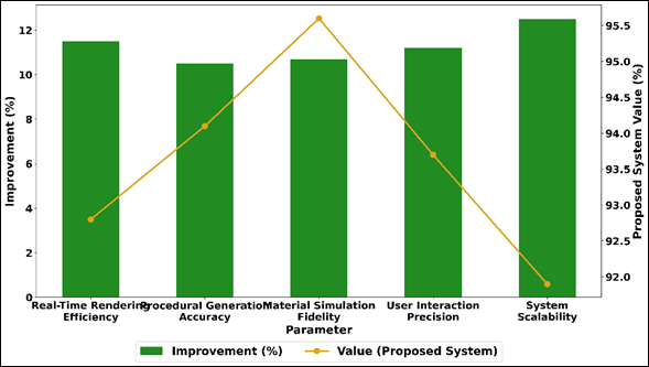 The fidelity of material simulation is 95.60, as the digital materials are highly realistic and responsive due to the use of advanced shaders and rendering. Existence of user interaction precision (93.70%) also proves correct mapping of user activities and the system responses, improving interaction and control. Also, the system scalability has the greatest improvement (12.50%), which points to the effective management of multi-user conditions and wide virtual space.