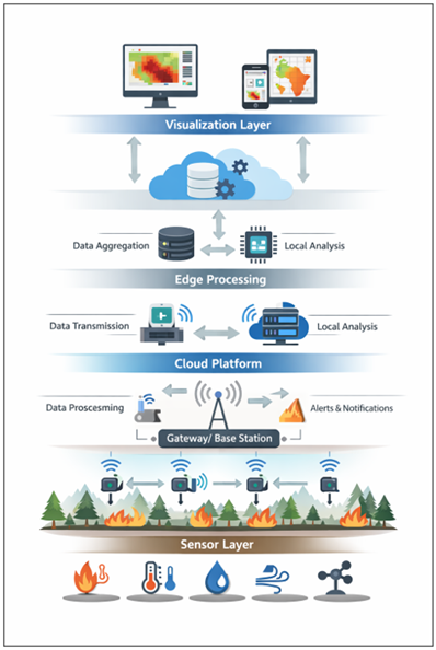 1. INTRODUCTION Forest fires can be discussed as one of the most problematic environmental issues of the contemporary age, which brings irreparable harm to the ecosystem and biodiversity, as well as human settlements. As the effects of climate change and human activities continue to rise, the intensity and frequency as well as the unpredictability of wildfires have risen to an unprecedented level. The conventional surveillance systems cannot be used any longer to deal with the dynamic and complex nature of fire outbreaks Priyadarshi (2024). Thus, the necessity to apply smart, data-driven, and real-time solutions that can address fires and at the same time forecast and visualize fire hazards increases. In this regard, the combination of the Internet of Things (IoT) technology with the Wireless Sensor Networks (WSNs) can be discussed as the promising solution to the improvement of forest fire monitoring and management systems. 1.1. Background and Motivation Forest ecosystems are important in ensuring ecological balance, biodiversity and also control of the world climatic conditions. The rising rate and severity of forest fires caused by climate change, human activities and environmental degradation has however become a very key concern to the whole world. Conventional forest fire surveillance systems that are based on manual surveillance, satellite surveillance or watch towers are in most cases poorly detecting, limited coverage area and costly to operate Singh et al. (2025). Such constraints largely decrease the efficiency of the early warning systems, causing serious losses to the environment, economy and people. In the recent past, the divergence of the IoT and Wireless sensor networks (WSNs) has manifested as a radical solution to real-time monitoring of the environment. WSNs built based on IoT offer scalable and affordable approach to data collection on a continuous basis in the distant forest areas Al-Karaki et al. (2004). It is possible to identify the initial signs of fire and determine the level of risk by installing distributed sensor nodes that can measure such environmental parameters as temperature, humidity, smoke concentration, and wind speed dynamically. Such technologies are not only increasing the level of monitoring but also providing the opportunity to make a decision in advance due to the use of real-time analytics and visualization Yadav et al. (2022). 1.2. Importance of Forest Fire Risk Visualization Management of forest fires also involves effective interpretation of the environment as well as detection of forest fires. Visualization is a connection between raw sensor data and actionable information, which allows the stakeholders to perceive intricate patterns and make relevant decisions. The massive amount of data produced by the IoT-WSN systems can be underutilized unless there is proper visualization, which will decrease their practical utility in disaster prevention and response plans Gulati et al. (2022). Visualization tools including the heatmap, geographic risk maps, and dashboards can enable the stakeholders, including the forest authorities, disaster management authorities, and policy makers, to understand the multifaceted sensor data effectively. The visualization of fire risk helps to turn raw data into useful information by showing the high-risk areas and trends over time, as well as suggesting the routes of fire propagation. It allows timely interventions, allocation of resources in the most effective way and better situational awareness Martalò et al. (2024). In addition, visualization is important in channeling the information on risks to non-technical stakeholders, thus improving the coordination and response measures. 1.3. Limitations of Traditional Detection Systems Although a number of forest fire monitoring methods are available, most of the conventional systems do not satisfy scalability, real-time, and reliable forest fire detection. Such systems are also usually limited by the technological factors, environmental factors, and operational inefficiencies that hamper their success in the early fire detection and risk assessment. Traditional ways of detecting forest fire like the satellite based surveillance and the human eye surveillance have some inherent limitations. Due to their ability to cover extensive geographical locations, satellite systems can also be faced with the problem of low temporal resolution, interference by clouds and slow transmission of data Agarkar et al. (2020). In the same manner, manual surveillance systems are highly reliant on human factor, which is subject to inaccuracy, exhaustion, and a restricted area. Also, the conventional systems do not offer the option of real time data and predictive information, which is very essential in early warning and prevention. 1.4. Role of IoT and Wireless Sensor Networks (WSNs) To address the shortcomings of the old systems, new technological innovations have been proposed to facilitate smart and automated monitoring of the environment e.g. IoT and WSNs. The technologies are very appropriate in large-scale and remote forest setting since they enable smooth collection, transmission, and processing of data Yaprakli (2025). The IoT-based Wireless Sensor Networks can be considered a paradigm shift in the domain of environmental monitoring, as they provide an opportunity to collect data in real time, on a distributed basis, and autonomously. Microcontrollers, communication modules and energy saving components are installed in sensor nodes that are placed all over the forests in order to help keep a check on the environmental conditions. These nodes exchange data with one another and send information to centralized or cloud based systems to process and analyze the information further Almufti et al. (2023). The benefits of using WSNs include scalability, low cost of deployment, and capability of operating in adverse environments, whereas the integration at the edges and in the clouds resul