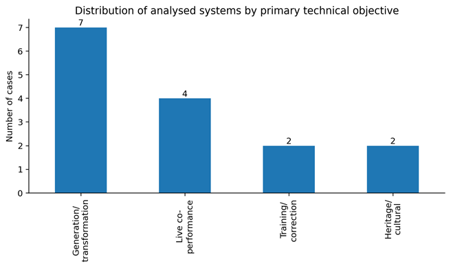 The dominant presence of the systems of generation and transformation is the first pattern that can be observed in the corpus. Seven out of the fifteen cases, as Figure 2 reveals, were mainly categorized under this category, with four live co-performance systems, two training/correction systems and two heritage/cultural systems. This observation points to the fact that the majority of recent technical work has been focused on the generation and manipulation of dance-like product as opposed to pedagogy, mutual improvisation, and cultural mediation. Output synthesis continues to be the center of gravity of the field. In even the systems that purport to be creative or collaborative, most are structured around the challenge of producing completed motion sequences based on music or some other input.