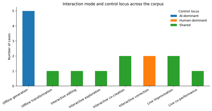 This is further explained in the interaction-mode profile in Figure 3. The only form of interaction that is the most prevalent is offline generation, which is closely linked to the AI-dominant control. The model is often placed as the key source of movement in these systems, with the human role being to curate data, promptly engineer, select a model, or post-hoc evaluate. The shared control is significantly more widespread as soon as interaction is live, editable, or co-creative. Interactive editing, live improvisation, co-performance and heritage exploration all demand interfaces where the human retains or reclaims significant control over timing, selection, interpretation, or performance. Control is thus not a predetermined aspect of AI in dance. It is highly dependent on the point of choreography workflow insertion of the system.