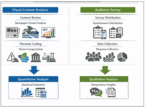 and Approach The current research paper is descriptive and analytical in nature as it critically analyzes climate change as a visual discourse and its effects on perception by the audience. The descriptive aspect aims at the discovery of patterns, frequency and features of climate related images in newspapers, whereas the analytical aspect examines the connection between such depiction and interpretations among the audience. A mixed method design is adopted, which combines the qualitative methods (thematic and semiotic analysis) with the quantitative methods (survey data statistical analysis). The research is based on a cross-sectional design as it captures the information that is available at a specific time frame to understand the latest trends in media practices and perception by the society. This type of approach is especially appropriate in the case of interdisciplinary research in which measurable patterns and interpretative insights are needed. Figure 1