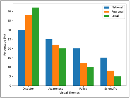 Figure 2 Thematic Distribution of Climate Change Visuals The Figure 2 demonstrates how much the visuals of disasters prevailed in the newspapers. It is evident in the bar/pie chart that the most attention is paid to the events that immediately happen and are visually striking, and scientific and policy-related visuals are underrepresented. Such imbalance implies that newspapers emphasize on attention grabbing information rather than the informative or solution based communication. These trends can contribute to an overall perception of the population in that they raise awareness of short-term risks instead of creating action and understanding in the long term. Table 3