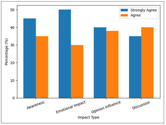 The findings suggest that a good number of the respondents think that images enhance awareness and cause emotion. About three-quarters (78) of them said that they are affected by visuals in their views, three-quarters (75) said that they are motivated to talk about climate change in the visuals in Table 5. These results underscore the influence of visual media in the formation of the discourse of people. Figure 5
