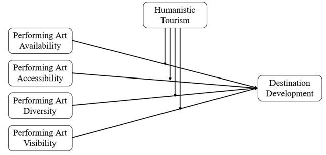 contributes to the destination development. Diversification to performing arts means that there should be a range and variety of tools and artistic expression in the destination to amuse the locals and visitors Choudhury et al. (2024). Different types of performing tools, generic dance, theatrical performance and multi-cultural festival celebration at the destination improve visitors' interests, experiences, satisfaction, and they extend their stay at the destination, which enhances social, financial, and economic conditions and processes, which leads to sustainable destination development Luo et al. (2023), Han et al. (2026). Research admits that diversification in the performing arts offerings enhances overall visitors' experiences, destination image, making it vibrant, inclusive and rich from social and cultural perspectives Byrd (2007). Moreover, diversity of the performing arts makes the destination unique, differentiated, contemporary, leading to sustainable practices, creativity, innovation, and cultural exchange. Additionally, it fosters community participation, ensures cultural identities and preserves cultural authenticity besides tourism and destination development Ngerndang et al. (2025). So, the study proposes that H3: Performing Arts diversity positively contributes to the destination development. Visibility of the performing arts refers to the showcasing, promotion, recognition, branding, and marketing of the tools, models, techniques, and methods associated with the cultural arts Kabanda (2014), Salem et al. (2026). There can be various methods for performing arts visibility, which include but are not limited to social media, electronic models, blogs and other digital platforms, and even tourism companies, and on-site promotion, however, the for the destination development, the best possible, feasible, viable and suitable need to be selected, keeping in view the social, financial and economic conditions to make it optimal from all aspects Mazlan et al. (2025), Salem et al. (2026). According to the research, visibility play pivotal role in shaping destination development, making it more attractive and sustainable. Literature admits that the availability of the performing arts tools and techniques is fundamental to tourism and destination development; however, their visibility to the targeted audience enhances awareness among locals and visitors, develops cultural identity and positively influences destination development Luo et al. (2023). Additionally, it enables destinations to enhance the value of the cultural resources by reaching the maximum targeted population. Strategic marketing and branding strategies like arranging and celebrating festivals, creating linkages with the local, regional, national and even internal organisations, working in the same domain, promote visibility of the performing arts and help in destination development Ngerndang et al. (2025). In a digitally mediated era, social media can be a better tool for promotion and visibility, which can bring a positive impact to destination development Mazlan et al. (2024). Based on these arguments, the study hypothesises that H4: Performing Arts visibility positively contributes to the destination development. Humanistic tourism believes in promoting meaningful engagement, authentic tourism practices and processes, aligning with cultural identity, empathy and understanding. locals and tourists are supposed to deeply believe in these sustainable practices, connect themselves deeply with these cultural experiences, to encourage and promote local traditions Rashid (2018), Smith and Diekmann (2017). According to the research, higher humanistic values encourage artistic production and make the experiences memorable. Similarly, humanistic tourism provides facilities and opportunities for accessibility and meaningful engagement, to understand, connect and develop inclusivity, empathy, and experiential depth, by accessing and using performing arts tools and facilities Higgins-Desbiolles (2006), Kim et al. (2010). Additionally, from a stakeholder perspective, making the performing art activities more diversified makes them more attractive and visible for the customers. Guided cultural tours and workshops develop more opportunities for performing arts tools accessibility and help in destination development Pung et al. (2020), Gerritsen et al. (2015). Furthermore, humanistic tourism believes in intercultural dialogue for cultural plurality, and engagement can harness performing arts diversity, encourage cultural narratives, and foster inclusivity, which becomes a source of sustainable destination development Wang (1999), Amorim et al. (2020). In the same way, the visibility of the performing art promotes tourism awareness, deeper appreciation, and stronger emotional connection, which leads to destination efficiency and effectiveness Hansen (2020), Higgins-Desbiolles (2018). These findings, relationship and arguments lead to H5: Humanistic tourism moderates the relation between performing Arts availability and destination development. H6: Humanistic tourism moderates the relation between performing arts accessibility and destination development. H7: Humanistic tourism moderates the relation between performing Arts diversity and destination development. H8: Humanistic tourism moderates the relation between performing Arts visibility and destination development. Based on the above-cited literature, findings, and relations, the study proposes the conceptual study model given in Figure 1. Figure 1 |