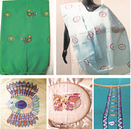 artist and he expresses them in their true essence. Jaffer (2016) In their actual form, these artworks were done on the walls, but to revive and preserve the art forms for future generations, they were given a contemporary update. To maintain their aesthetic value, researchers, educators, and industry professionals constantly experiment with novel resources and concepts. Ranjan (2007) However, famous artist Shree J. Swaminathan brought this art to people's awareness as early as when Bharat Bhavan, Center for Visual and Performing Arts in Bhopal was established. At that particular time, it was limited to wall art, murals, or canvas, and some artists received very little income. Realizing the charm and potential of this art, the Madhya Pradesh Mahila Vitta Evam Vikas Nigam and IFAD planned and sponsored a training workshop under the Tejaswini Rural Women Empowerment Programme. As a knowledge partner and trainer, NIFT Bhopal coordinated the program, conducted research, and needs analysis, designed the curriculum, and monitored its implementation at the NIFT Bhopal center. This training aimed to develop various products, especially women's and clothes decorated with traditional Gond Kalam motifs, to preserve that indomitable skill and at the same time generate a livelihood for the hard-working artisans who put so much effort into its creation. a saga of lively and rhythmic songs on surfaces. This was done to ensure a clean income for artisans and strengthen their independence from outside food sources. Although painted fabrics are one-time purchases, a selection of clothing can quickly secure a place among today's aesthetically trained customers. Keeping this in mind, NIFT planned and organized a 15-day training in Bhopal. These training modules introduced the most common and important tools and techniques of fabric painting, choosing motifs, making repetitions, placing designs on fabric, etc. They are taught how to use pattern marking on unstitched fabric in garments (Kurta, Scarf, Stole, Crop Top, Skirt, Dupatta etc.) which ultimately improves their design skills and helps them make their product financially viable. The preparation of tracing sheets for final products on