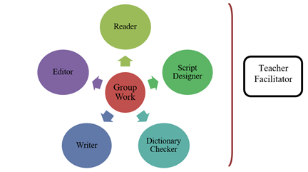 their social and cultural values (Turner). 2. ROLE OF STUDENTS IN THEATRE Students worked collaboratively in groups, with the teacher taking on the role of facilitator and supervisor. Initially, the teacher read the opening scene of the play. Following this, students were divided into four groups, each consisting of five members’ assigned specific roles: a reader of the text, a writer of the script, a checker of vocabulary, a reviser and corrector, and a designer of the script responsible for acting and body language. In order to encourage students to explore different endings, the teacher encouraged them to develop a narrative with multiple characters to ensure each student could take on a role. At the culmination of the lesson, students began rehearsals to enhance their acting skills and subsequently presented their improvised plays. Figure 2