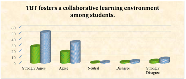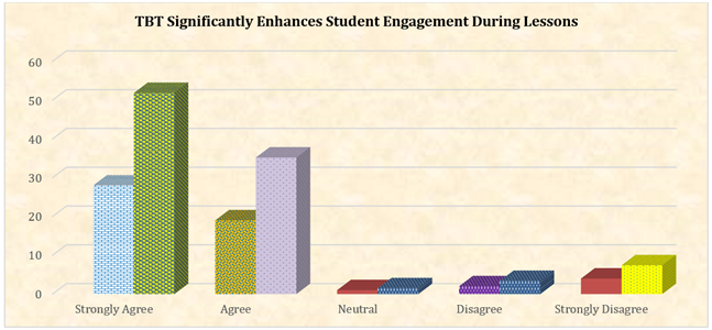 10.1. INTERPRETATION · Positive Perception: A majority of respondents either strongly agree or agree that TBT significantly enhances student engagement during lessons, with a combined total of 39 (21 strongly agree + 18 agree). · Neutral Views: A small number of respondents are neutral, indicating neither agreement nor disagreement. · Negative Perception: A combined total of 13 respondents (7 disagree + 6 strongly disagree) express some level of disagreement with the statement. Overall, the data suggests that a significant portion of respondents perceive TBT as effective in enhancing student engagement during lessons, while there are also some who disagree or strongly disagree with this perception. Table 3