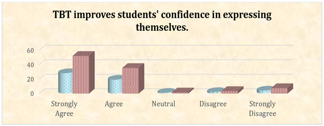 10.5. INTERPRETATION · Positive Perception: The data indicates that a majority of respondents (36 out of 54) either strongly agree or agree that Theatre-Based Teaching (TBT) improves students' confidence in expressing themselves. This suggests that the implementation of theatre-based techniques in teaching is perceived positively in terms of its impact on student confidence. · Neutral Views: A very small number of respondents (4 out of 54) remain neutral on the statement. · Negative Perception: The relatively low numbers of respondents who disagree or strongly disagree (14 out of 54) further support this notion, indicating that there's a generally positive perception of TBT's role in enhancing students' confidence levels. Overall, the data suggests that TBT is seen as an effective method for improving students' confidence in expressing themselves. Table 7
