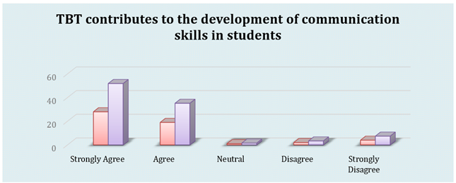 10.9. INTERPRETATION · Positive Perception: A majority of respondents (45 out of 54) either strongly agree or agree that Theatre Based Teaching (TBT) TBT contributes to the development of communication skills in students. · Neutral Views: A very small number of respondents (2 out of 54) remain neutral on the statement. · Negative Perception: There are respondents (7 out of 54) who either disagree or strongly disagree with the statement. This indicates that there is a minority of individuals who do not believe that TBT contributes to the development of communication skills in students. Overall, the data suggests that there is a positive perception among the majority of respondents regarding the effectiveness of TBT in contributes to the development of communication skills in students.