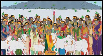 Vrindavan's villagers, birds, and animals from Indra's wrath; Radha and Krishna