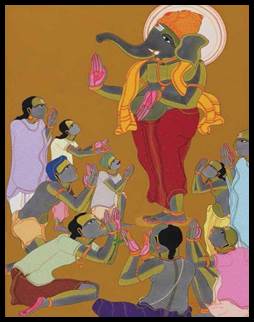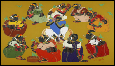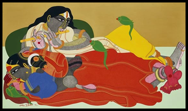 emotions of love and sacrifice for the contemporary society. Vaikuntham portrays Krishna as the epitome of love and Ganesha as a symbol of renunciation. Krishna as an iconic symbol of love is beautifully articulated in paintings based on Krishna and Radha and Krishna and gopis. Krishna is also depicted as a protector, for instance in the painting titled as Krishna and Gobardhan Mountain, in which Krishna is protecting the cowherds and animals by lifting the mountain on one of his fingers. In the Ganesh Puja artwork, the artist has portrayed the people's faith and devotion to Lord Ganesha. In the depiction of Shiva doing the tandav, Shiva is recognized for his abilities as a destroyer and conservator. Each icon in Hindu iconography holds its own identity and significance. The artist wants to convey a powerful message to art enthusiasts and fellow artists that, despite the numerous representations of Ganesha and Krishna abundantly available in the long history of Indian art, an artist can still revisit, re-think, re-appropriate these perennial symbols of love and sacrifice with renewed energy and great enthusiasm. More importantly, Vaikuntam’s diverse articulations, interpretations, appropriations and adaptations based on Hindu iconography reflect a deep emotion to make these iconic divinities strike a chord with the present world order and inspire the contemporary man to distance from the greed of materialistic yearnings and seek peace in the spiritual way of life taught by the great Hindu religion.
