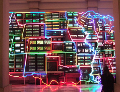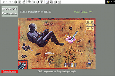 Hoskote formulates four distinctive experiential approaches that characterize the Indian art practice today. The first experiential approach aims at revitalizing painting; the second attempts to redefine sculpture; the third addresses the virtual space introduced by the Internet; the fourth engages with the post-studio-gallery-museum system called public space. The common force, however, between all the four directions is the availability and easy accessibility to new media, materials and technologies, which have played a crucial role in not only redefining or revitalizing the conventional modes of art practice but, at the same time, have been responsible for a great shift in the equation between art and audience. The approach that is of relevance to the present article is the third one that negotiates with the virtual vis à vis the technology of Internet. Hoskote refers to the works of Baiju Parthan and Jitish Kallat for drawing inspiration from the “coded symbolism” of Internet and science. Their works engage and address the questions raised by technology or the “political uses of technology” – neurology, genetics, cybernetics, quantum mechanics. The questions that negotiate the interface between life and technology – “self in relation to the noosphere, the technosphere and society.” Parthan is considered as among the earliest artists in India known for venturing into the virtual world of World Wide Web. His response to the new technology came at the time when computers and the Internet were becoming common in India. In 1999 he made his first digital interactive work titled as Brahma’s Homepage. The work meditates on the attributes of the revolutionary technology that has created an alternative virtual world where the communication with the physical world is managed by computer program coding system. As a departure from the conventional painterly