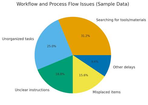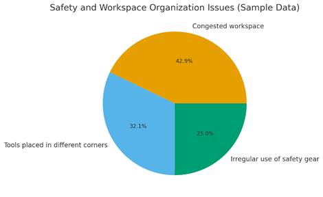 and Workspace Organization Analysis: The workshop space was cramped; the rate of movement was very restricted, and this, in turn, slowed down working procedures. Tools were scattered in every corner rather than stored in a fixed location. This added to around 32% of the observed issues of safety and organization. Safety practices-such as gloves or goggles-were followed intermittently, making up about 25% of the concerns. General congestion remained the most prominent issue at about 43% as clutter blocked pathways and regular obstructions were common. Interpretation: A disorganized, non-safe work environment is less efficient since workers are navigating through clutter to accomplish tasks and have to search for tools. Irregular safety practices also show a lack of discipline, increasing the vulnerability to accidents. Such an unstructured environment slows the pace of work, thereby negatively impacting productivity, and this calls for better organization in structure and consistency in safety habits.