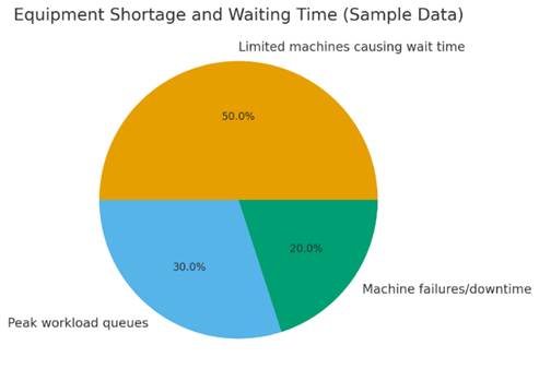 Shortage and Waiting Time Analysis: This is further explained in the pie chart, where 50% is contributed by limited machines because sometimes workers have to wait for a welding machine, grinder, or cutter. Peak workload congestion contributes 30%, during which the available equipment cannot meet the demand. Machine failures take the other 20%, with breakdowns creating additional downtime since no backup units can get the machines up and running. Interpretation: The data indicates that the scarcity of equipment acts as a big bottleneck within the workshop. Long waiting times and occasional breakdowns reduce daily output and slow overall production. Improvement in machine availability and maintenance would greatly enhance workflow efficiency. 3) Material