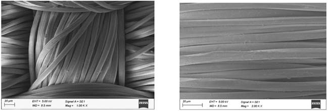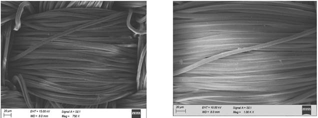 3.3. SEM study of the polyester fabric The polyester fabrics subjected with different treatments (desized, sodium hydroxide treated, polyvinyl alcohol treated and the subsequent dispersed dyed) were undergone for SEM studies and the images of the them are shown in Figure 1. It is seen from these figure that there is a subsequent differences in the images of the SEM micrographs of the polyester fabrics (desized, sodium hydroxide treated, polyvinyl alcohol treated and the subsequent dispersed dyed). The improved effect subsequently is due to the effect of sodium hydroxide treatment and the periodical polyvinyl alcohol treatment and dyeing. A focused beam of high-energy electrons is used in scanning electron microscope to generate the variety of signals at the surface of solid textile samples. The electron–sample interactions provide signals that reveal the information about the samples including the texture (external morphology), crystalline structure and orientation of materials of the sample. The scanning electron microscope also provides the capability of performing analyses of selected point locations on the sample Roberts, RC 1969, Usenko, V 1979.