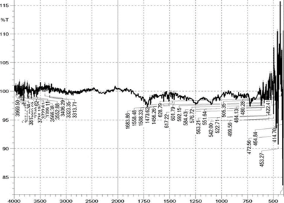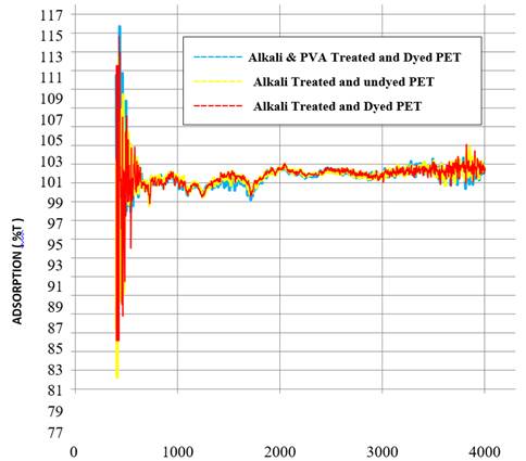 3.4. FTIR analysis of the polyester fabric The polyester fabrics treated with different treatments (desized, sodium hydroxide treated, polyvinyl alcohol treated and the subsequent dispersed dyed) were undergone for FTIR study and the graphs are shown in the Figure 2 FTIR graphs of the Polyester Fabrics (a-sodium hydroxide treated, b-polyvinyl alcohol treated and c-the subsequent dispersed dyed) and Figure 2a respectively. These graphs give the indication about the effect of sodium hydroxide and the subsequent polyvinyl alcohol on the polyester fabrics. From the Figures 2 and 2a it is revealed that as the polyester fabrics are treated with sodium hydroxide and the polyvinyl alcohol, the peak area of FTIR graph is differed which gives the indication for the effect of application on the polyester fabric. It can be observed that the broad peak in the spectra of polyvinyl alcohol treated polyester fabrics has influenced in peak intensity which indicates that the surface hydroxyl (OH) groups in the polyester fabric and indicates the presence of polyvinyl alcohol over the polyester fabric surface. The IR bands shown are in the region of 1700–600 cm and correspond to C=O, C–O and C–H vibrations respectively37, 41, 42. The important other peaks are due to the O–H stretching which is around 3600 to 3700 with reference to the standard data shown in the Table 3.