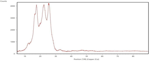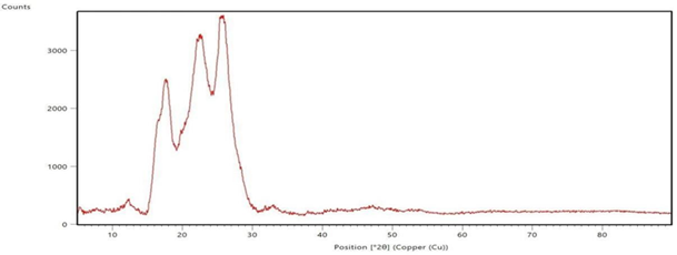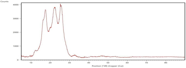 4. XRD analysis of the polyester fabric The polyester fabrics treated with sodium hydroxide, sodium hydroxide followed by polyvinyl alcohol, and their subsequent disperse dyeing respectively are subjected for XRD study and the graphs are shown in the Figure 3 XRD spectrograms of the Polyester Fabrics (a-sodium hydroxide treated, b-polyvinyl alcohol treated and c-the subsequent dispersed dyed). These spectrograms give the indication about the effect of sodium hydroxide treatment and the polyvinyl alcohol treatment on the polyester fabrics. From the Figure 3 (a, b & c) it is revealed that as the polyester fabrics are treated with sodium hydroxide, polyvinyl alcohol and their subsequent disperse dyeing, the bandwidth of the XRD graph is differed which gives the indication for the effect of application in these conditions on the polyester fabric. X-ray diffraction is a common materials characterization technique that allows for identification of crystal orientations and inter-atomic spacing. X-rays are used for this because the wavelength is on the same length scale as inter-atomic spacing and lattice parameter values. The presence of characteristic peaks corresponding to the polyester crystalline in the XRD pattern of the respective treated fabrics indicates that the treatment of sodium hydroxide and polyvinyl alcohol on the polyester fabric surface does not affect the inherent crystalline structure of the polymer; rather it enhances the increase of the hydrophilic functional groups Uchida, E, Uyama, Y, & Ikada, Y 1989, Zhang, C, Yang, F, Wang, W, & Chen, B 2008, Zhifeng, Z, & Kun, Q 2007.