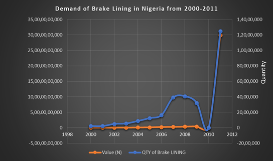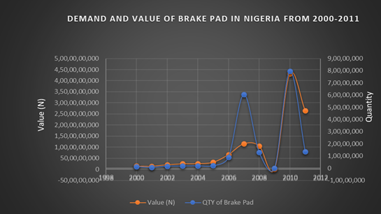 Manufacturing of automobile spares in developing economic like Nigeria will go a long way in meeting the demand of spare parts, improve the socio-economic status of country and create jobs for the teeming youth. 1.1. Brake Pad Demand in Nigeria Market Demand for product or service is the cause for developing new product or expansion of production capacity or provision of the needed services. Knowing the particular time to meet this demand for products or service is very critical and important in order to satisfy the customer needs. The demand for brake pad in Nigeria is high; as data obtained from National Bureau of Statistics showed that between 2000-2011 about 185,113,536 of brake pads and 28,965,552 pieces of brake linings were imported into Nigeria, valued at over 42bn Naira. This indicated that in this period, the average annual demand of brake pad in Nigeria is 15,426,113 for brake pad and over 2 million pieces of brake lining valued at about #3.5 billion.