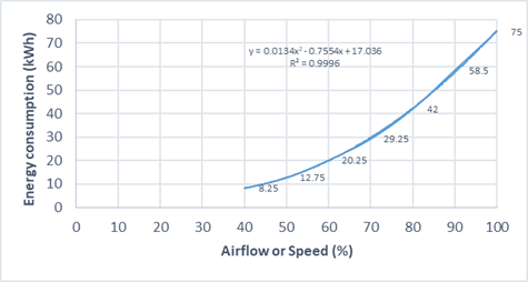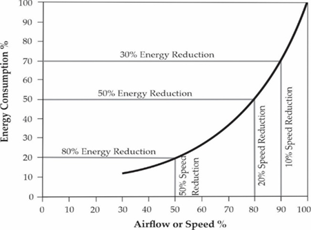 Therefore, the required power becomes proportional to the cube of the flow. The fan would operate at 50% of the speed to generate 50% of the flow. At this stage of operation, the fan would only involve 12.5% of the rated power (0.5 × 0.5 × 0.5 = 0.125 or 12.5%) (Lönnberg (2007)). In theory, a 50% decrease in flow results in an 87.5% decrease in the energy input. However, the exponent often ranges from two to three in real-world applications, which means that the savings are reduced despite the changes in the exponents. As shown in Figure 2, reducing the fan engine speed by 10% requires about 70% of the energy, whereas reducing the fan engine speed by 20% requires only 50% of the power. The installation of a VSD on the fan engine enables the fan to match this decreased ability automatically, slowing down as a reaction to decreased demand, and thus saving energy (Gonen (2018)).