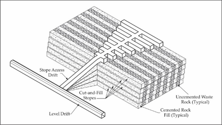 2.2. UNDERGROUND MINE MODEL Ventilation can be defined as the lifeblood of a mine in which the intake airways act as arteries by bringing oxygen to the mine’s working areas and act as veins by removing pollutants from the mining areas to be expelled into the atmosphere (McPherson (1993)). The primary objective of an underground ventilation system is to provide adequate amount and quality of fresh air to dilute contaminants to secure levels in all areas of the mine where the staff needs to work or travel. A ventilation shaft or audit is developed to supply fresh air to the mine. At this point, regulators and continuously installed ventilation fans control the direction of airflows. For distributing fresh air to working areas, auxiliary ventilation systems are used with temporarily mounted ventilation fans and spiral ducting (Tuck (2011)). The underground mine ventilation supplies fresh and adequate volume of air to dilute and remove dust and noxious gases and controls the temperature of the working areas. The primary sources of these harmful gases are the equipment running on diesel engines and explosive blasts. In this study, an underground mine extracting ore by the cut-and-fill method is evaluated in terms of the ventilation requirements and the adaptation of the VSDs to the auxiliary ventilation system. Cut-and-fill is the descriptive term applied to the mining methods that require the filling of excavated voids with waste material to progress the ore production. This fill is necessary to maintain support for the subsequent openings or to act as a working platform for further mining (Stephan (2011)). In cut-and-fill mining, the ore is extracted in several horizontal drifting slices. In overhand cut-and-fill mining (mining on top of the backfill), which is the most preferred variation, mining starts at the lower level and works upward. When a slice is mined out, the gap is filled with waste material (Figure 3). To reach the ore body, generally, a spiral ramp is driven, and several stopes can be extracted simultaneously to provide flexibility in the mine.
