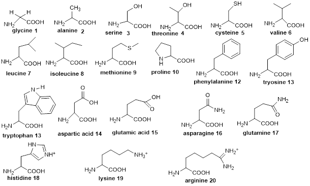alpha-amino acids are shown in fig 1 below. Figure 1: Structures and names of the 20 amino acids Glycine 1 is the simplest and a conditionally