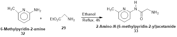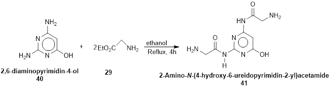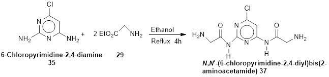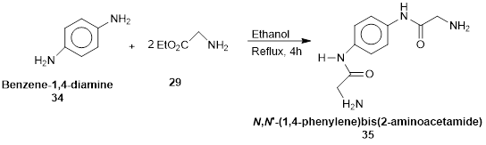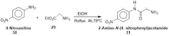 Journal of Research -GRANTHAALAYAH, 8(9), 368-382. https://doi.org/10.29121/granthaalayah.v8.i9.2020.338 Received Date: 1 June 2020 Accepted Date: 30 September 2020 Keywords: Glycine Esterification Molecular Docking Celecoxib and Rofecoxib Inhibitory Activity Ethyl glycinate was synthesized by the Fischer esterification protocol, and its amide derivatives; 2-amino-N-(nitrophenyl)acetamide 31, 2-amino-N-(6-methylpyridin-2-yl) acetamide 33, N,N'-(1,4-phenylene)bis-(2-aminoacetamide) 35, N,N'-(6-chloropyrimidine-2,4-diyl)bis-(2-aminoacetamide) 37, and 2,4-(diamino-N’N-6-hydroxypyrimidyl)acetamide 39 respectively were obtained by coupling reactions of 4-nitroaniline, 2-amino-6-methylpyridine, 1,4-diamino-N,N’-benzene, 2,6-diamino-4-chloropyrimidine and 2,4-diamino-6-hydroxypyrimidine respectively with ethyl glycinate. These compounds were characterized on the basis of their melting points, UV-Visible, IR, 1HNMR and 13CNMR spectroscopic analyses. The results obtained from the spectra were consistence with the assigned structures of the compounds. The synthesized compounds were subjected to molecular docking with a target protein, 1CVU to compare their binding energies with celecoxib and rofecoxib which are standard drugs that inhibit COX2 enzyme. From the docking results, the binding energies values of the above synthesized compounds are -5.8 kJmol-1, -6.2 kJmol-1, -7.2 kJmol-1, -7.4 kJmol-1 and -7.6 kJmol-1 respectively. Compound 39 showed the highest binding energy of -7.6 kJmol-1, close to celecoxib and rofecoxib with binding energy values of -8.0 kJmol-1 and -8.2 kJmol-1 respectively. This result indicates that compound 39 possess some level of inhibitory activity against COX2.