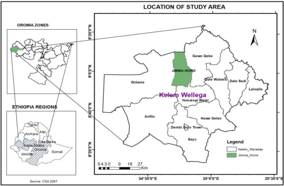The survey was conducted in Jima Horro District of KellemWollega Zone. Jimma Horro district is located at 641kmWest of Addis Ababa. The altitude of the district ranges between 1400 and 1800 meters above sea level, with average annual minimum and maximum temperature of 18 °C, and27°C, respectively whereas the yearly rain ranges from 700 to 1000 mm (Ethiopian Digital Elevation Model, 2019). In the survey area agriculture is the major economic activity of the district. The livestock resource of the study district comprises of 66267 cattle, 19421 sheep, 13647 goats, 257 horses, 6809 mules, 9873 donkeys, and 68401chickens (Jimma Horo Livestock office 2018). The total human population of the district is about 56403, of which 50% is reported to be male (Ethiopian Digital Elevation Model 2019).