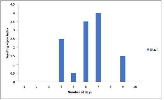 From the result in Figure 9, sixth day had the highest seedling vigour (4), followed by that on the fifth day (3.5) while the least (1) was obtained on the ninth day. The first, second, third and fourth day had zero emergence.