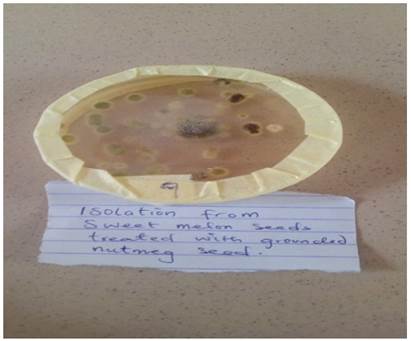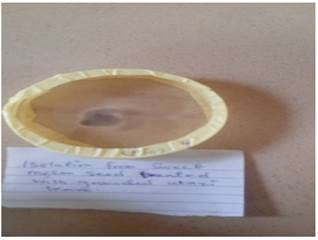 Ten petri dishes were used for each of the plant extracts and synthetic fungicides simultaneously. The control consisted of one Petri dish with untreated seeds of sweet melon. Sweet melon seeds which were dressed with the crude powdery plant extracts and synthetic fungicide were plated on Petri dishes containing three layers of blotter paper moistened with distilled sterile water. A total of thirty -one plates were used for the sweet melon seeds treated with the various plant extracts and synthetic fungicide.