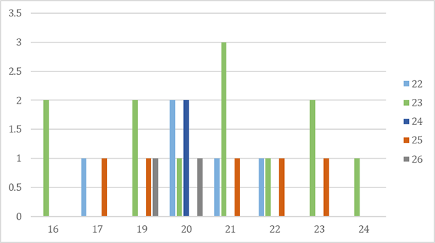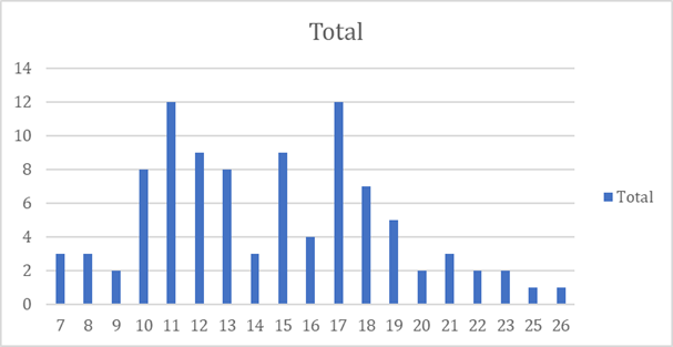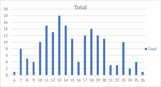 Based on bar chart 3, it’s also the gender chart showing the score. In this chart it shows the male scoring. The X axis shows the number of people having the specific score and the Y axis shows the score from 6 to 26. Out of 272 responses 96 were male responses. In the 96 responses 6 of the responses were having score 22 and above.
