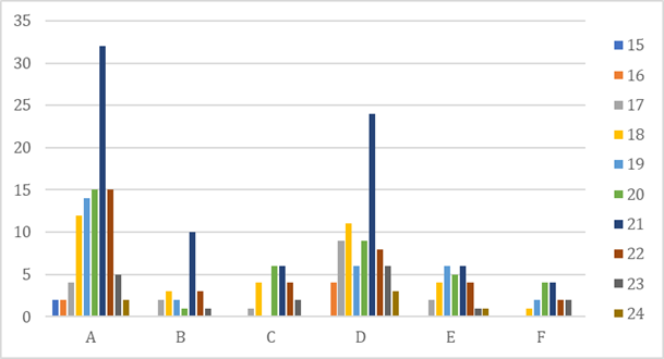 Based on bar chart 4, it shows the area of headache where it is confined to and how many people fall into each category. The X axis shows each option from A to F which people chose, and the Y axis shows the number people who chose the specific option. The right side of the chart shows the age of subjects with different colours which is the bar in the chart. Option A shows more prevalence which is 103 and age group 21 is more in this, followed by option D (80 individuals), option E (29), option C (23), option B (22), option F with the least number of individuals which is 15.
