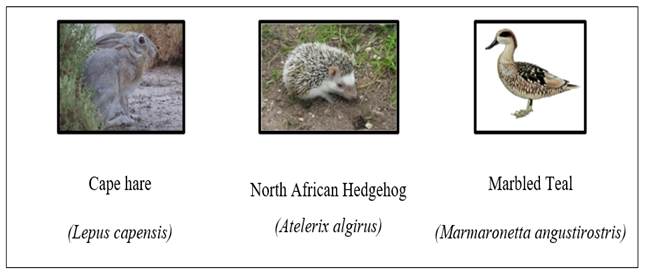 Three representative species were chosen respectively: Cape hare, North African Hedgehog and Marbled Teal Figure 4.