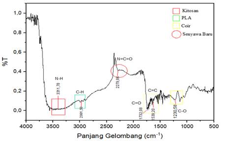 These results indicate that the addition of a composite mixture of PLA/Coir/Chitosan indicates the presence of a new compound formed, namely N=C=O.
