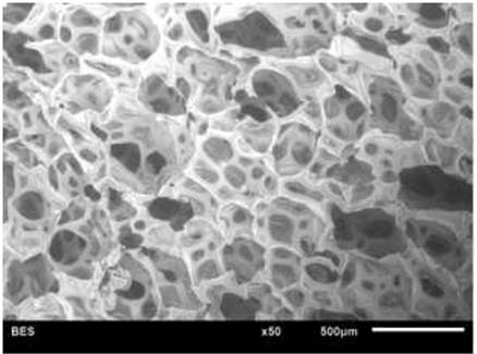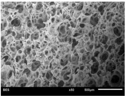 Figure 4 shows the results of SEM photos taken at a magnification of 50 times. From the picture, it can be seen that the surface of the sample is hollow, and the cracked surface is quite dominant and white spots are visible. In Figure 5 the sample is also displayed at a magnification of 50 times. The results show that the surface of the hollow composite material is cracked and there are white spots that are more clearly visible than the previous image. These white spots are chitosan that has not been spread evenly. The picture also shows the presence of white spots which indicate that the distribution of chitosan has not been uniform.