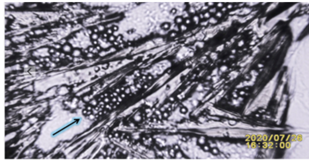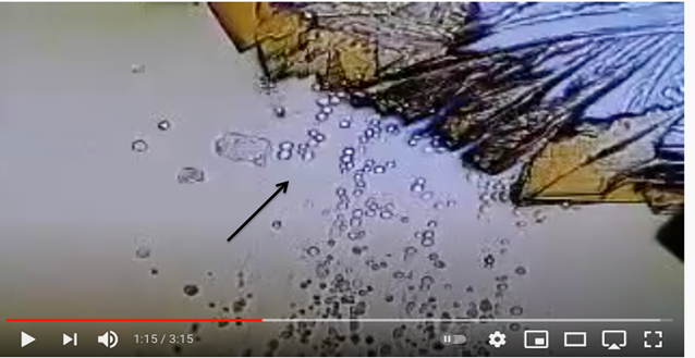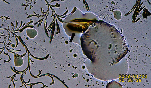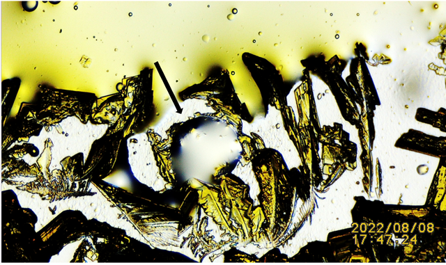 Figure 8 N:1 Black Arrow: Pointing at Potassium Ferricyanide Crystals Penetrating and Spilling Harvested Lizard’s Lipid Droplet. For Additional Details Link to: Video link https://youtu.be/zoPhBH_-fHc |
