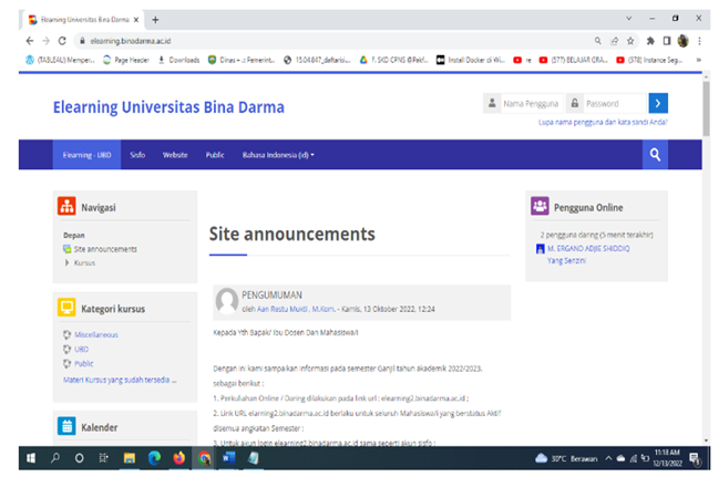 Observations or observations are performed by visiting directly the address of the E-Learning Moodle of the University of Bina Darma with the aim of obtaining information about the e-learning moodle. On the main display of the application there is a login form page for the user, as well as user menus owned by the university to be shown to the users such as students and lecturers of the main page on the e -learningMoodle can be seen in Figure 2.