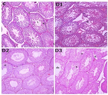 necrosis in testicular section. D3 shows (ds) Depletion in spermatogonia and