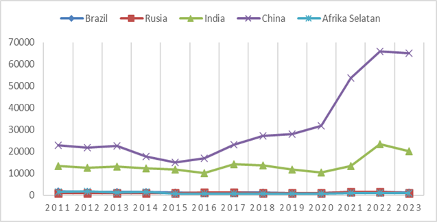 The image show that China dominates as objective Indonesia's exports among the BRICS countries with continuing trend increase significant, especially since 2020 until reach peak in 2022 with mark around 65,000 million USD. India occupies position second with mark relative exports stable range between 10,000-20,000 million USD, although experience improvement moderate in 2022. Meanwhile that, export to Brazil, Russia and South Africa show relative value low and stable below 5,000 million USD throughout period This pattern. indicates existence big gap in mark Indonesia's exports to BRICS countries, where export still very concentrated to China, meanwhile market potential in other BRICS countries not yet utilized optimally. This is open opportunity for Indonesia to do diversification of export markets to other BRICS countries, considering the magnitude potential the economy and markets owned by each country.