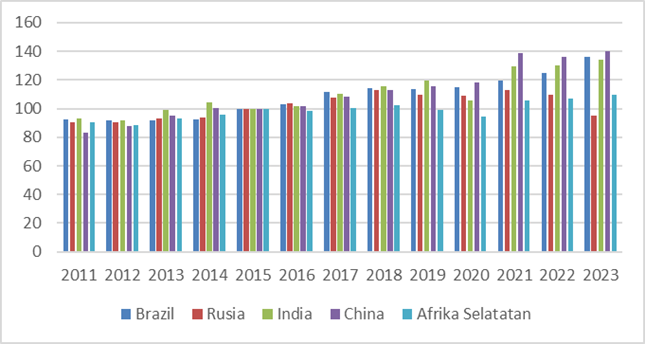 The image show Indonesia's Export Volume Index (VIE) to BRICS countries (Brazil, Russia, India, China, and South Africa) in period 2011-2023. In general, visible trend improvement export to all BRICS countries, especially after 2020. China and India show more growth rapid compared to other countries, indicating increasing request to Indonesian products. While that, export to Brazil, Russia and South Africa also experienced increase, although with level more growth varies. Increase export volume index This reflect market diversification and more strong connection Indonesia's trade with BRICS countries in a number of year final.