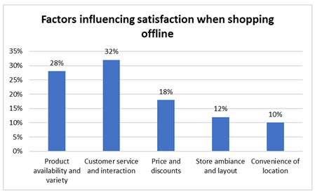 According to the research, the most important element influencing customer happiness in physical stores is customer service and contact (32%), underscoring the need of individualised and attentive in-store experiences. At 28%, product availability and variety come in second and third, respectively, indicating that consumers continue to place a high value on a large selection. 18% is made up of price and discounts, indicating a modest cost sensitivity. Convenience of location (10%) and store atmosphere and layout (12%), on the other hand, have a comparatively smaller influence, suggesting that although these elements improve the shopping experience, they are not the main variables influencing customer satisfaction for the majority of customers.
