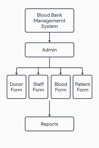 When the system is initiated, the admin logs in and gains access to multiple modules based on permissions. Upon a donor’s visit, their information is captured in the Donor Form, and they are assigned a unique donor ID. If the same donor returns, their history is retrieved based on this ID. For staff and patient registrations, similar workflows are followed. Blood units are logged and categorized by blood type, and their availability is updated in real-time. The Billing Form allows the system to generate bills for patients requesting blood, while the Blood Issue Form logs every unit dispensed, maintaining full traceability. Reports such as daily collections and donor databases can be generated on-demand, facilitating smooth and accountable operations.