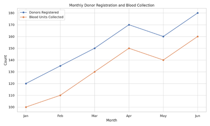 The analysis of donor engagement and blood collection metrics reveals an encouraging trend in community participation. Over the months from January to June, the number of donors registered steadily increased from 120 to 180. Correspondingly, blood units collected rose from 100 to 160. This positive correlation reflects effective awareness and outreach strategies, possibly through well-managed blood donation campaigns. Figure 1 demonstrates this upward trend, highlighting how donor numbers directly influence blood availability, critical for timely patient support.