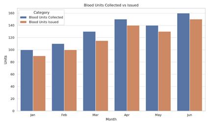 A crucial component of operational efficiency in a blood bank lies in its ability to issue the collected blood in response to demand. The monthly comparison between blood units collected and those issued shows that while collections grew, the issue rate also closely followed suit, ensuring minimal wastage and optimal stock utilization. In March, 130 units were collected while 115 were issued, and by June, 160 were collected with 150 issued. This close margin confirms efficient stock turnover and demand satisfaction. Figure 2 provides a side-by-side view of these two aspects, reinforcing operational responsiveness.