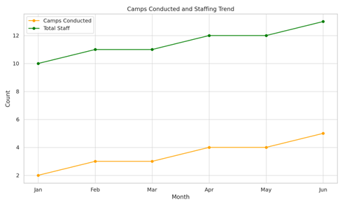 The number of blood donation camps conducted serves as a direct influencer of donor registrations and collections. Starting with just 2 camps in January, the number increased to 5 by June, which aligns with the rise in donations. Meanwhile, staff numbers were incrementally increased from 10 to 13 to manage this growth effectively. Figure 3 showcases the trends in both camp frequency and staff deployment. This proportional scaling of resources with demand ensures consistent service delivery and enhances donor and patient experience.