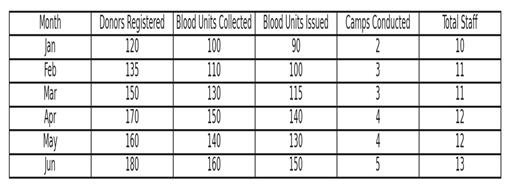 To facilitate comprehensive analysis and decision-making, a summary table presents key metrics across six months. This includes donor registrations, blood units collected and issued, camps conducted, and staff count. The highest donor turnout occurred in June (180), while the most blood units were collected in April (150). Such data is vital for forecasting resource requirements, planning logistics, and identifying peak operational periods.